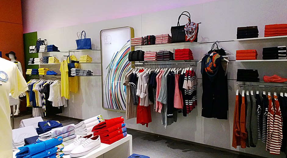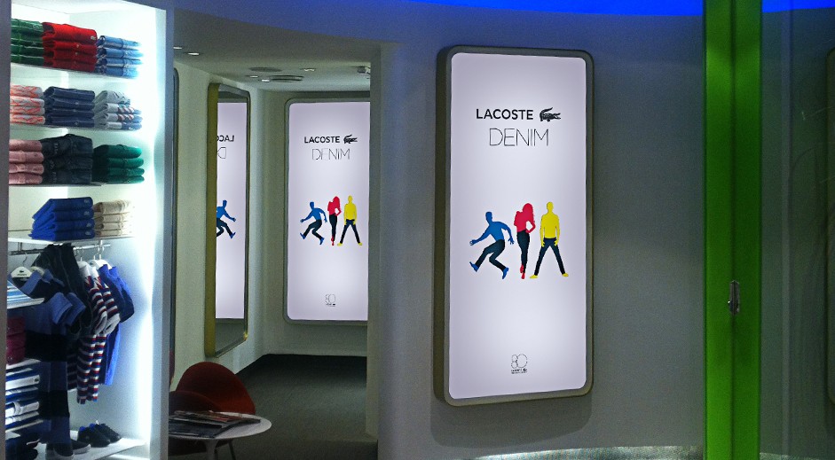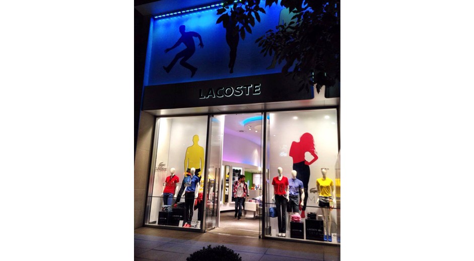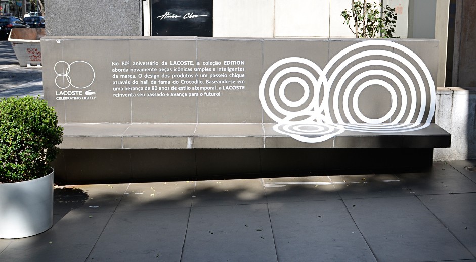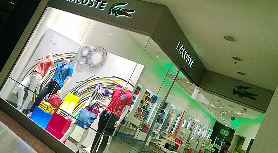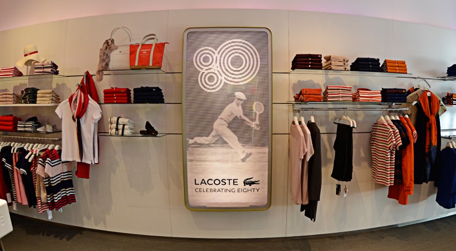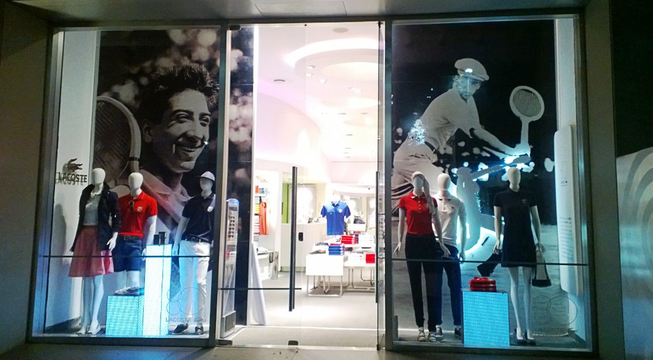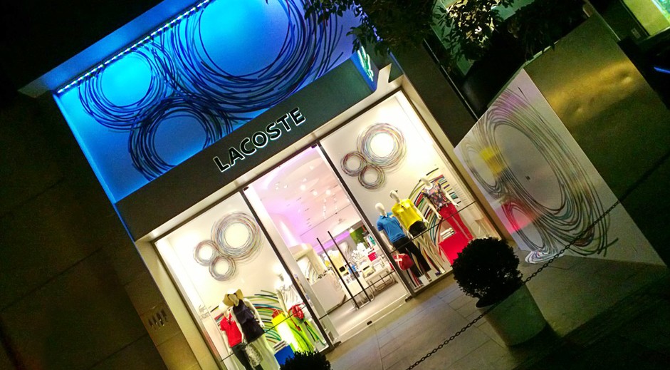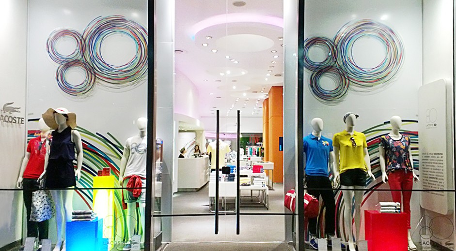 Criação e projeto de vitrines para Lacoste em comemoração dos 80 anos da marca, com peças que geram interatividade com o consumidor, além de ambientação do anterior da loja com mobiliários modulares e modernos.