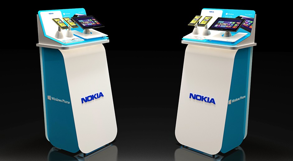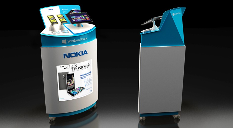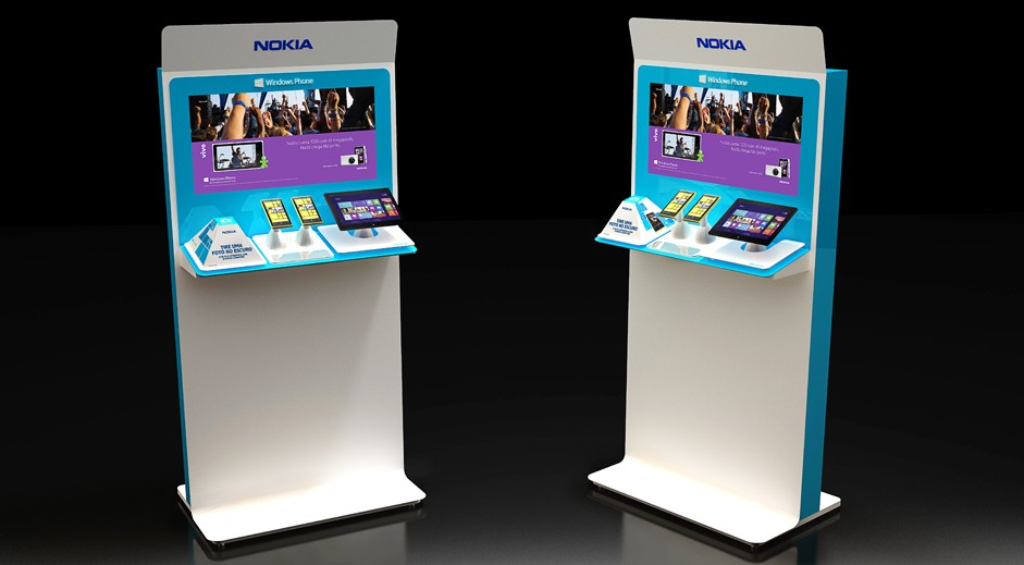 Displays interativos e quiosques projetados para gerar experimentação junto ao consumidor e mostrar a integração entre o smartphone, tablet e notebook através do sistema windows